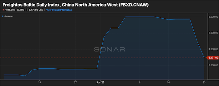 Last week, global energy markets and container shipping faced turmoil due to escalating missile exchanges between Israel and Iran, alongside worries about Iran’s potential retaliation for U.S. bombings and the threat of closing the Strait of Hormuz. These developments had significant consequences for oil prices and logistics. However, a tentative ceasefire between the U.S. and Iran has provided some respite, potentially preventing major disruptions. Despite the ongoing conflict, tanker operations through the Strait of Hormuz and activities at Dubai’s Jebel Ali Port, the busiest in the Persian Gulf, continued largely as normal, as did operations at Israeli ports. Iranian missile strikes did result in several Israeli casualties in at least one instance. As the immediate crisis in the Middle East appears to be calming, focus is now shifting back to the U.S. trade war and the imminent expiration of tariffs. Countries besides China that are impacted by U.S. reciprocal tariffs must finalize their agreements by July 9, or risk facing higher duties. However, progress in talks with key trading partners such as the European Union, Canada, and Vietnam has been slow, although a preliminary deal has been made with the United Kingdom. President Donald Trump has shown openness to imposing tariffs on his own if agreements are not reached, even as some officials in his administration propose extending negotiations for those demonstrating genuine effort. In the context of the U.S. trade situation, it was expected that an agreement would be reached to uphold a 30% baseline on imports from China, but specific information has been limited. Nonetheless, the initial spike in demand that occurred after the May 12 halt on tariffs, prior to the August 12 deadline for lower U.S. tariffs, seems to be diminishing. Since March, carriers have boosted trans-Pacific capacity by 43% and are now experiencing a significant drop in container spot rates, especially for the West Coast. Following the tariff pause on May 12, container rates for eastbound trans-Pacific shipments have fallen from their peak levels. (Graph: SONAR). According to SONAR’s Freightos Baltic Index, the prices for shipments from Shanghai to Long Beach have returned to levels seen in late May, around $3,700 per forty-foot equivalent unit (FEU). Meanwhile, rates for the East Coast have decreased from $7,200 to $6,300 per FEU. In contrast, Asia-Europe shipping rates increased by 6% last week, reaching $3,100 per FEU, while prices for shipments to the Asia-Mediterranean region dropped by 9% to $4,400.