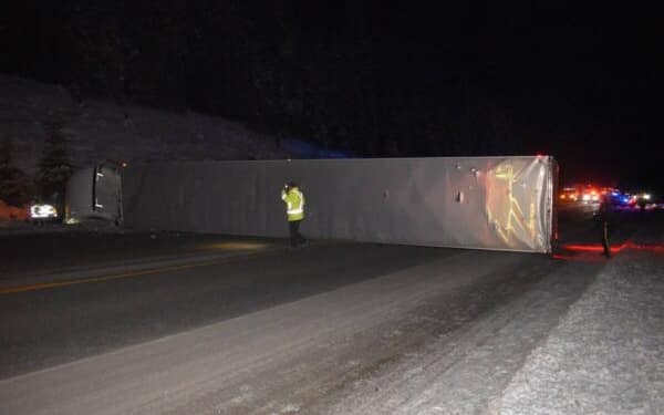 “Luckily the tow truck operator, the police officer, and the Mercedes driver were safely off to the side of the road, or they would certainly have been killed,” says Corporal Michael McLaughlin with BC Highway Patrol. “The tractor-trailer driver could easily have died as his truck rolled over and he became trapped.”