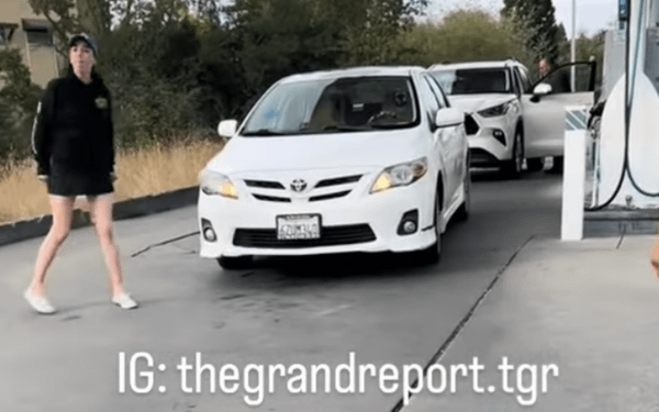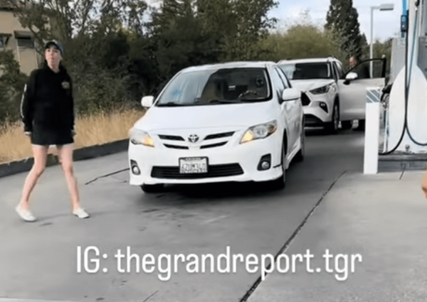 The truck driver pans the camera to show the various other options the woman has to make her way out of the gas station parking lot, and eventually even shows a man who is presumably her boyfriend getting out of the car and looking somewhat defeated.